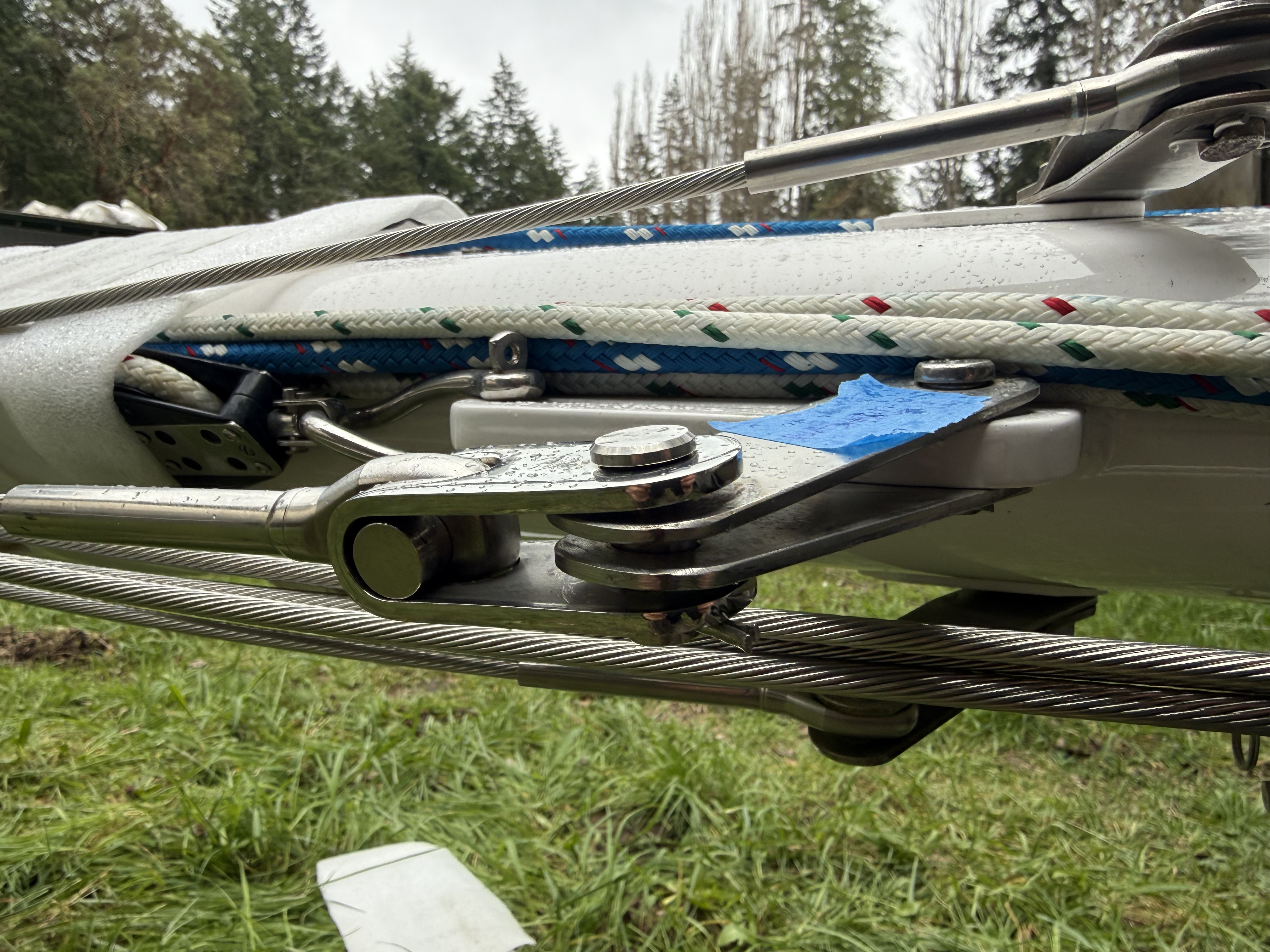 Hi folks, I’ve hooked up my rigging to the mast today. This picture is the attachment for the staysail stay. It doesn’t look right the way it’s seated in the tang. Should there be stainless washers to shim the gap and center the toggle? Have I done this wrong? Also, you can see the intermediate shroud above there’s a lot of lateral space around the eye terminal (same with all the shrouds). Is that much play normal? Thanks in advance.