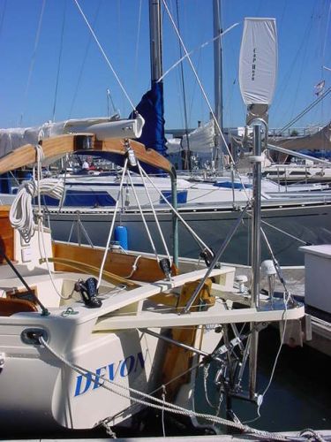 I led the control lines for the servo-rudder to tiller connection between the taffrail and aft deck. Blocks were attached to the knees that support the taffrail. The angle formed between these blocks and the tiller is about 30 degrees. Therefore, the lateral force that turns the tiller is only about 80% of the actual force developed by the servo-rudder - less friction. Attached are two photos from BCC Devon, showing the servo-rudder to tiller connection led along the bumpkin. Based on the photos, the angle formed between the turning block on the bumpkin and the tiller is very close to 90 degrees, i.e. other than friction, the full force developed by the servo-rudder is used to turn the tiller.